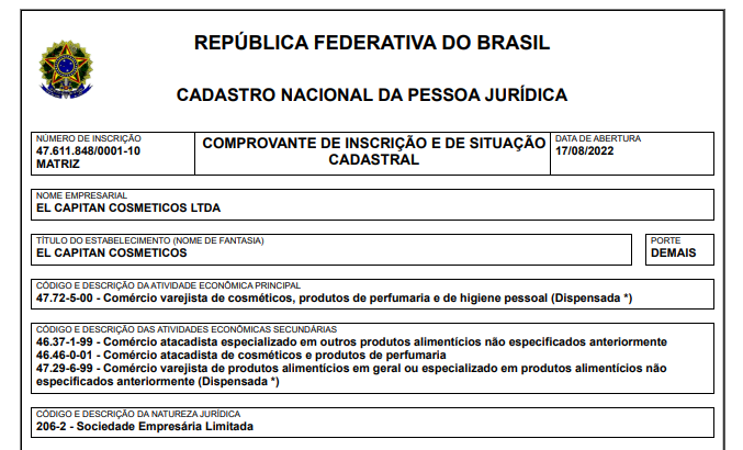A El Capitan Cosméticos é uma empresa com CNPJ ativo e regularizado, em total conformidade com as leis fiscais e tributárias do Brasil.